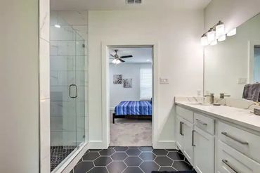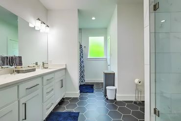 INDOOR LIVING: Smart TVs, dining table, ceiling fans, walk-in shower/tub in bedroom 1, desk